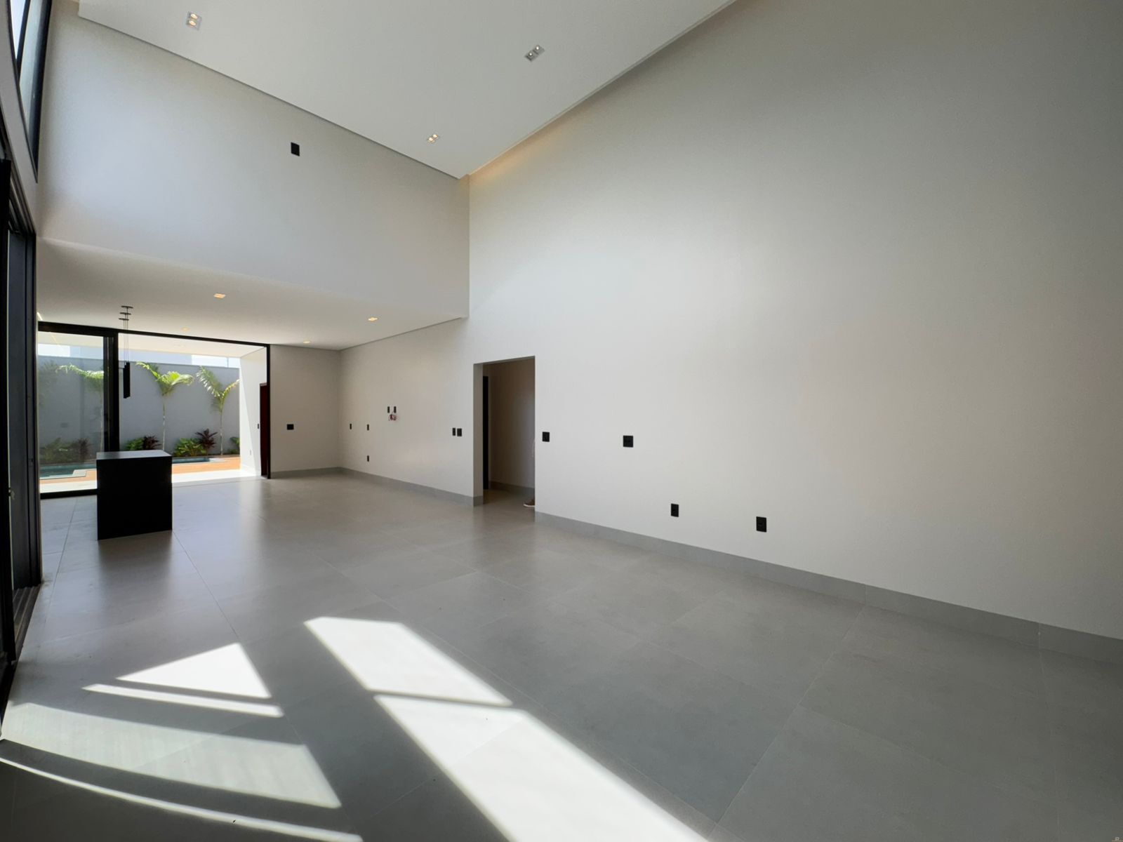• Ampla sala de TV e jantar com pé-direito duplo e detalhes em pele de vidro.