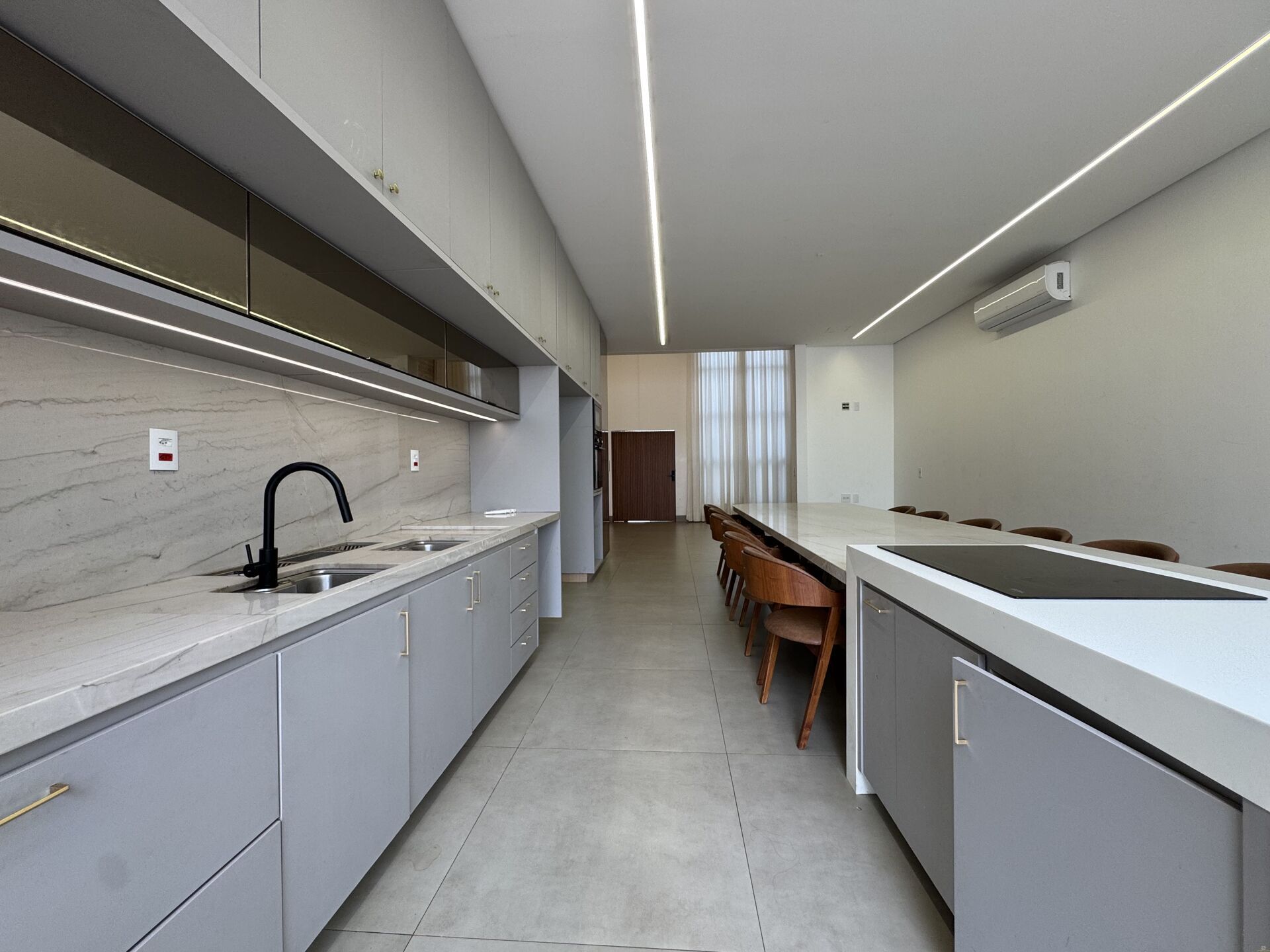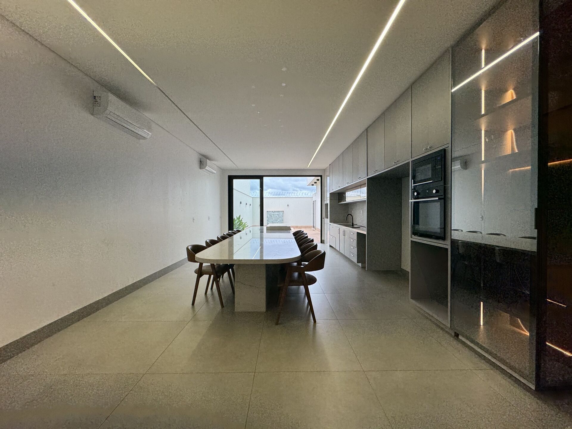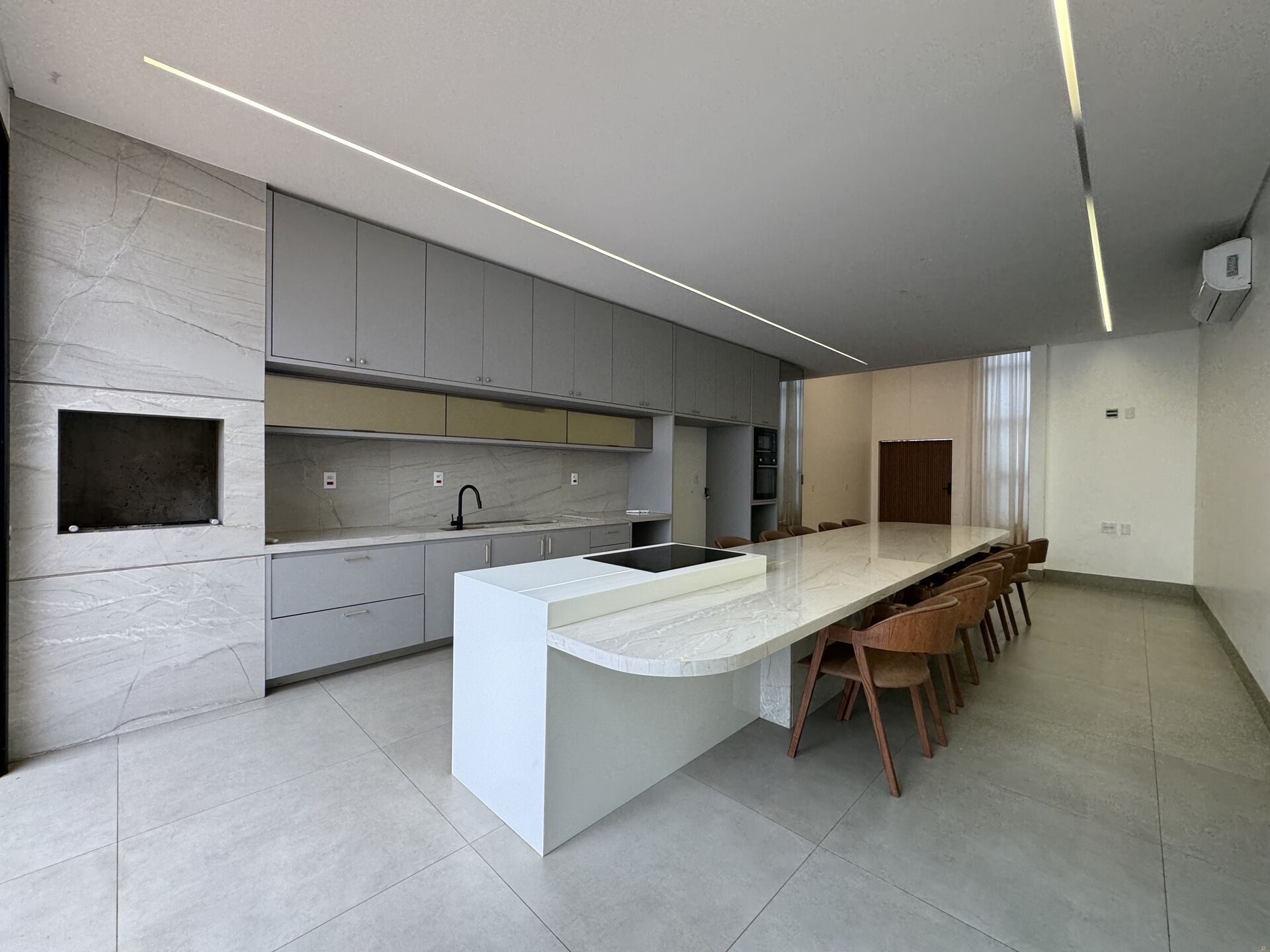 Cozinha grande integrada com área de churrasqueira, + ilha central em mesa com 12 cadeiras.